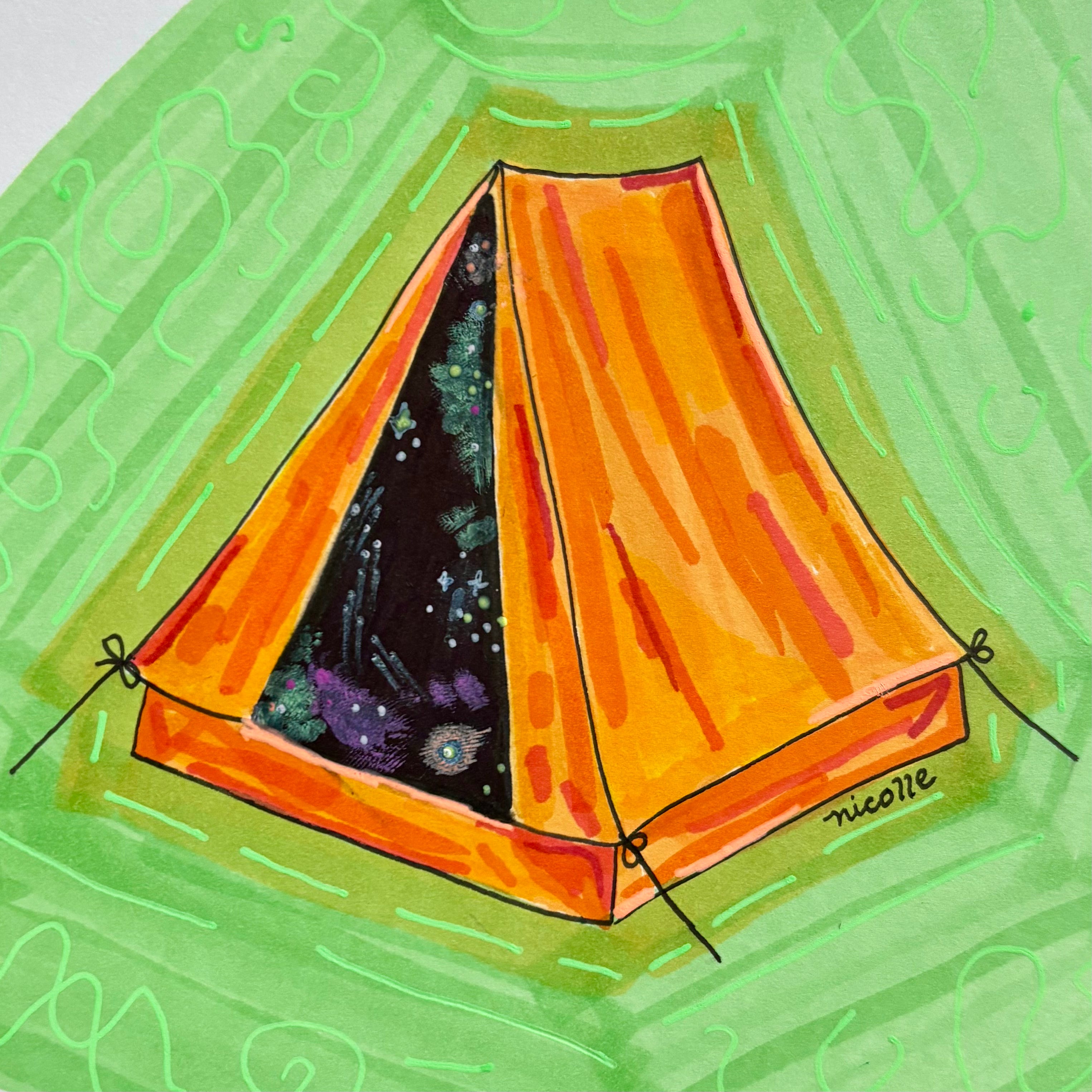 I can’t live my prorated, tiny tent life stuck marred with concern, so I’ve made my tent home in the best ways I can. Human bodies don’t need 100 square feet or more to sleep. I tuck a West Elm-chic twin-sized air mattress into one corner, draped with neutral-toned cable-net throw blankets, hang in the corners creamy pink silk ribbons, and keep a stack of books to read by my bedside, relying mostly on New York’s light pollution and a battery-powered night sky projector to illuminate the pages.
